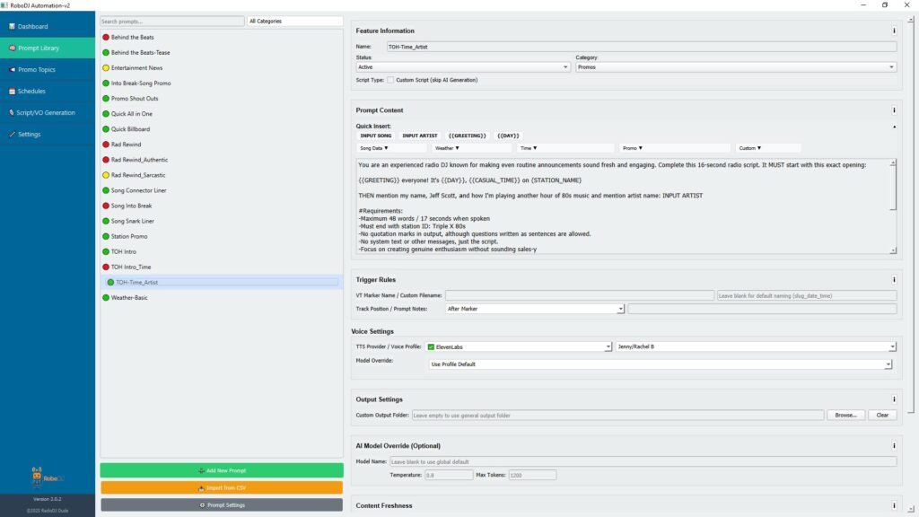 Leave it to the AI prompt to craft just the right forecast for your station. Of course, you can add as many different prompts/styles as you like. Plus, assign different AI voices to different dayparts. It’s always sunny inside RoboDJ!